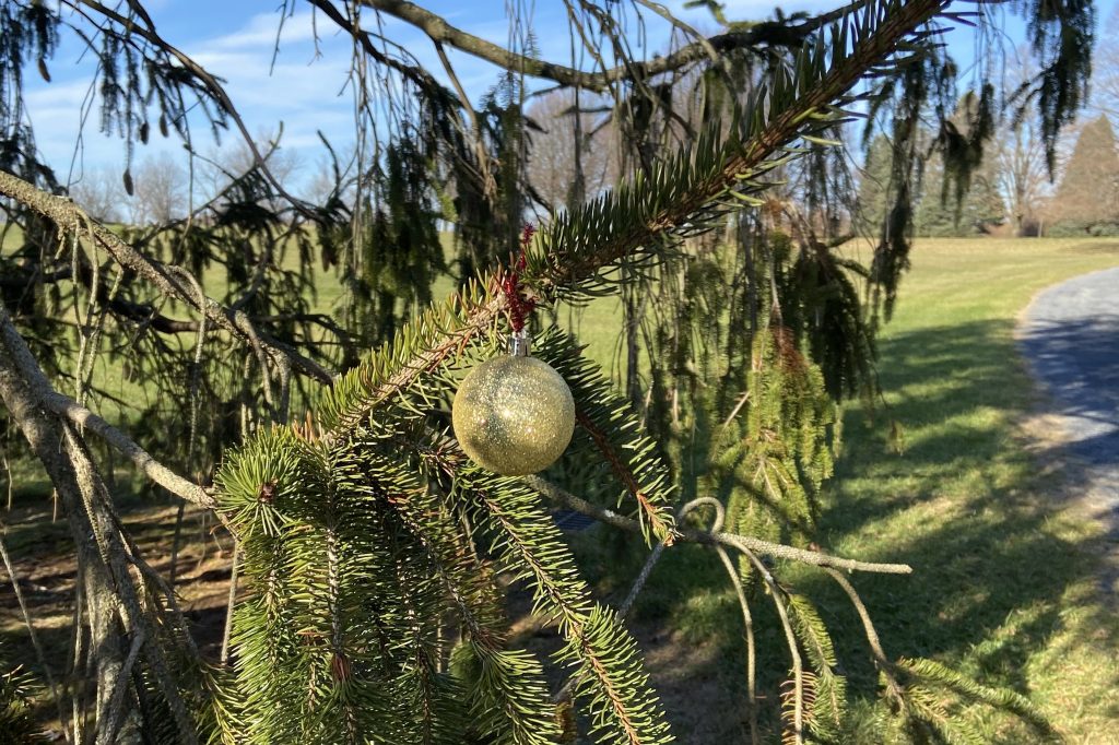I had come to my walk in a familiar park, Louise Moore Park in Northampton County, Pennsylvania (just a few minutes drive from my house). The paths in the Park are neither fancy nor wild. They amble through fields. Some are mowed to ankle depth while others have been left wild for birds to nest and scavenge. Along some sections of the path are groves of 8 or 10 mature copper beeches, maples, oaks, and pines. I wondered who had taken the time to offer these gifts along the path. It wasn’t the rangers and it likely wasn’t a paid worker. The balls were not hung with panache or professionally placed. Some were tied to branches with unraveling yet colorful ribbon, some with sparkly twisted pipe cleaners, others hung on a colored metal hook that contrasted with the color of the Christmas ball it attached to the tree. Someone had anonymously hung the path with shiny bright objects that could not be missed and that made smiles emerge and childlike delight fill hearts that needed a bit of joy.