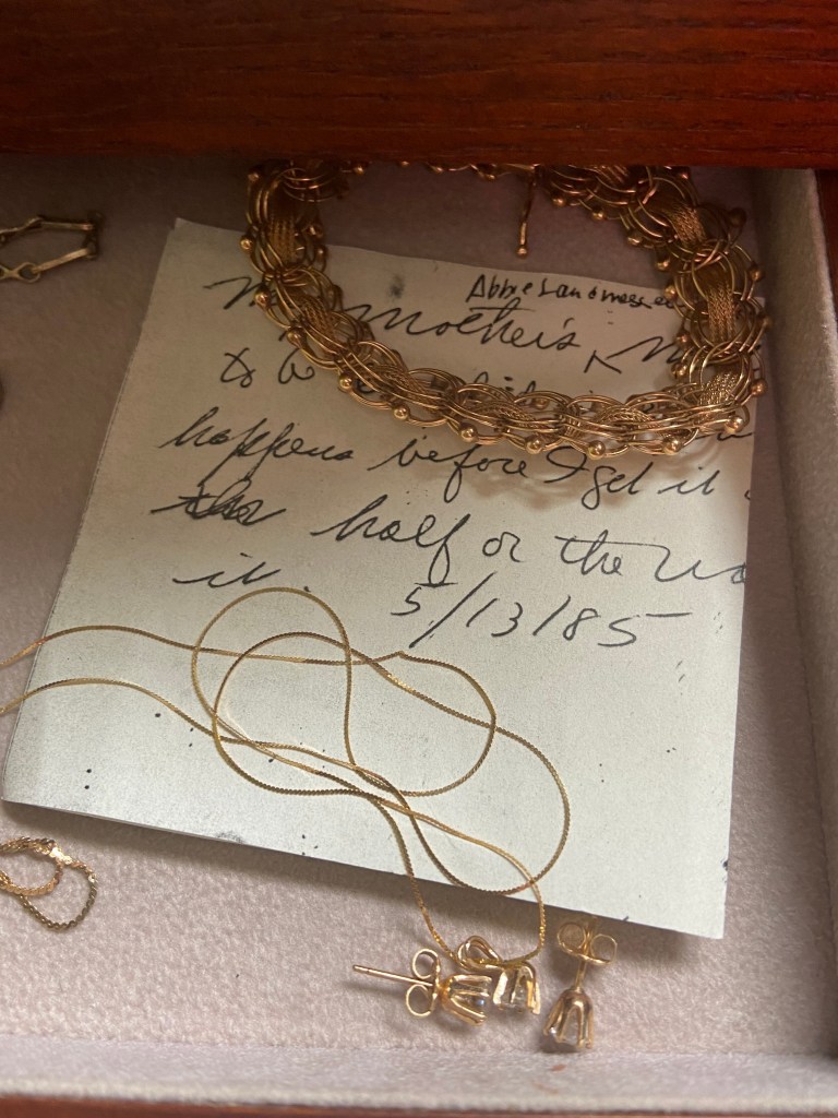 Dad gave me a necklace awhile ago that he purchased as a boy for his mother on Mother’s Day.  It took sacrifice and saving up for him to buy it and it is precious to me.  It isn’t valuable monetarily, but it means the world to me and when I wear it I feel loved.  I have always treasured jewelry that was worn by those I love.  I believe that some energy or matter is exchanged between things worn and the life spirit of the wearer so that when I put a ring or necklace on that belonged to a loved one I feel closer to the person it belonged to.  I also have my great grandmother’s wedding ring and my mother’s engagement ring – those will be in my Treasure Chest.